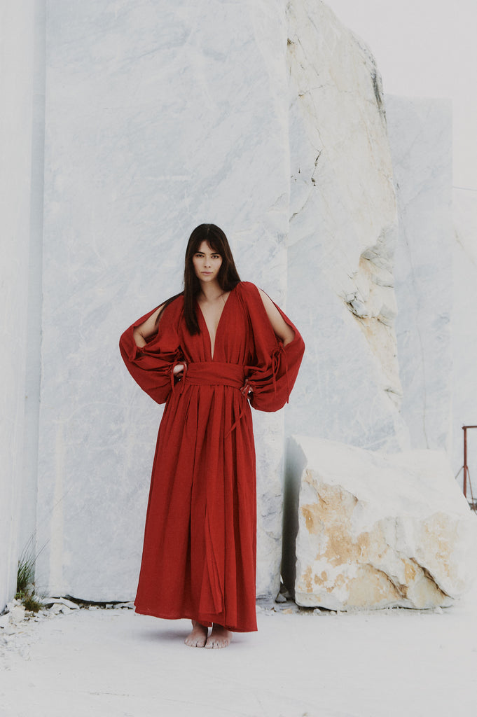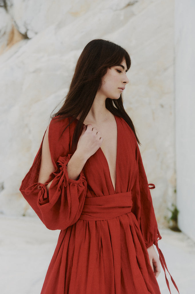 -Featuring an ultra low plunging neckline, long wrap around belt, high front slit and adjustable arm ties. -100% handwoven organic cotton -machine washable on gentle cycle max 30C