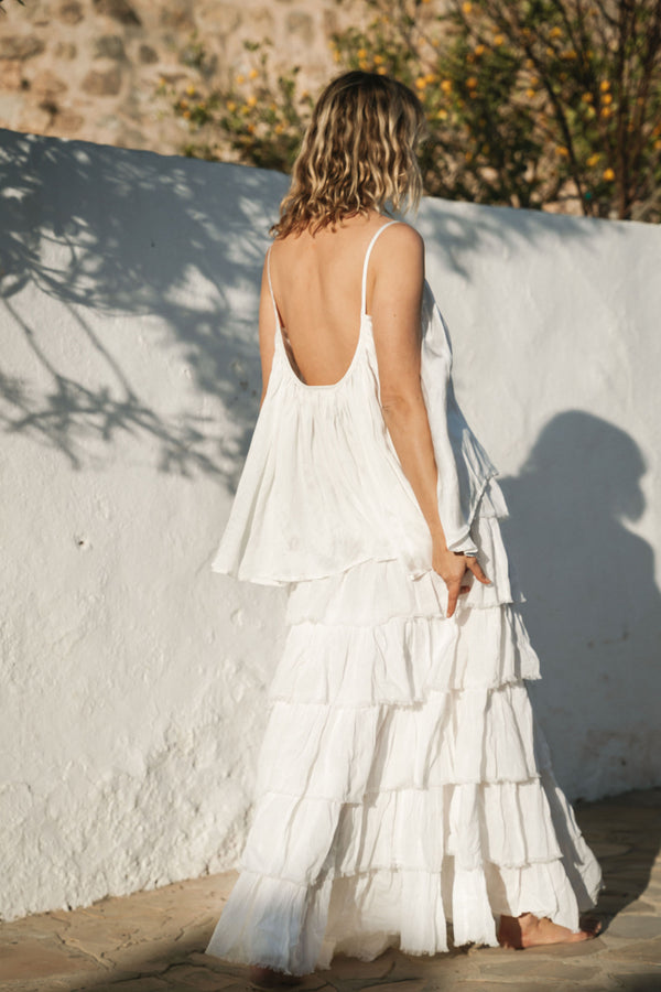 The Breeze Cami in white is a beautiful, barely there wardrobe essential for sunny days or layering. A seasonless and versatile staple with ease and elegance. A flowing fit with deep scooped neck, low back and dropped hem.