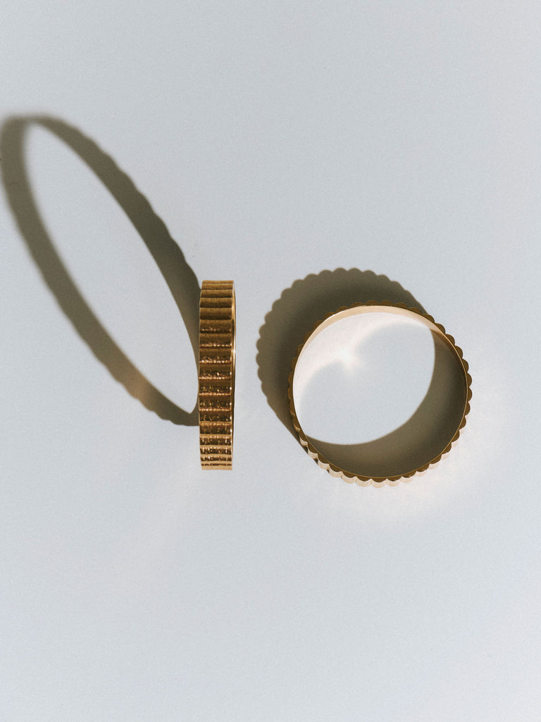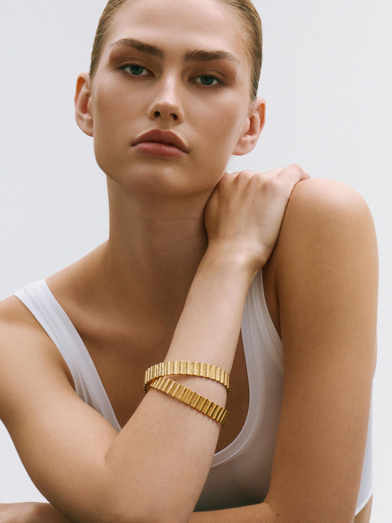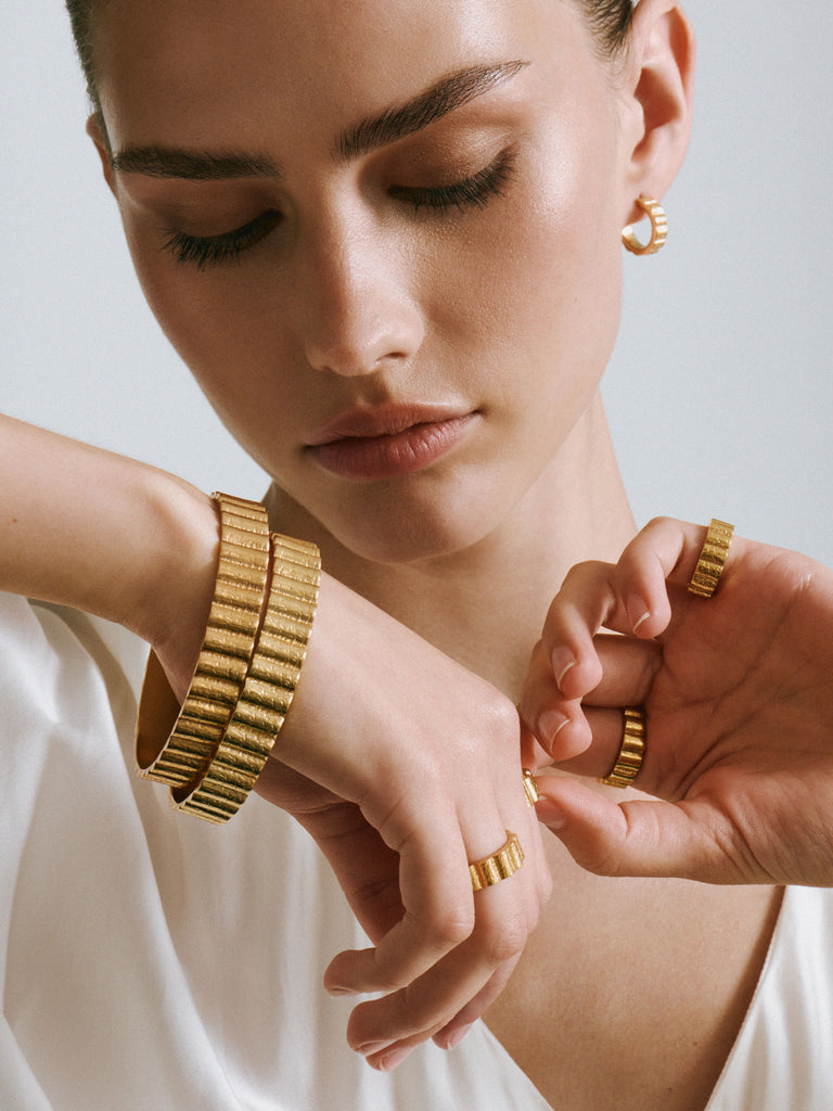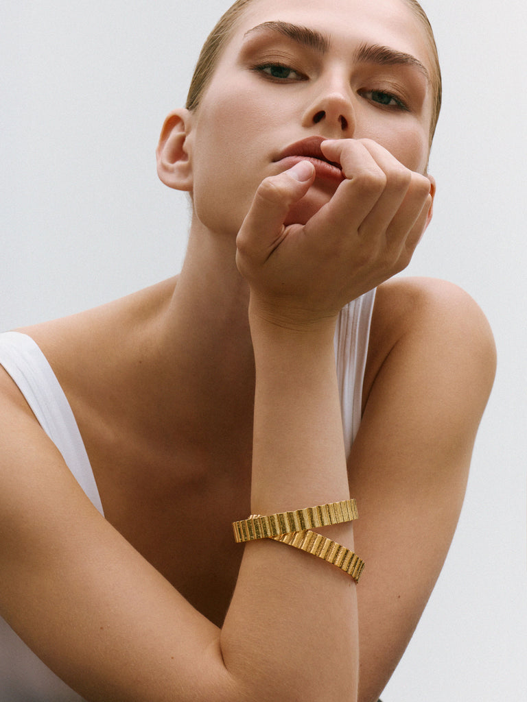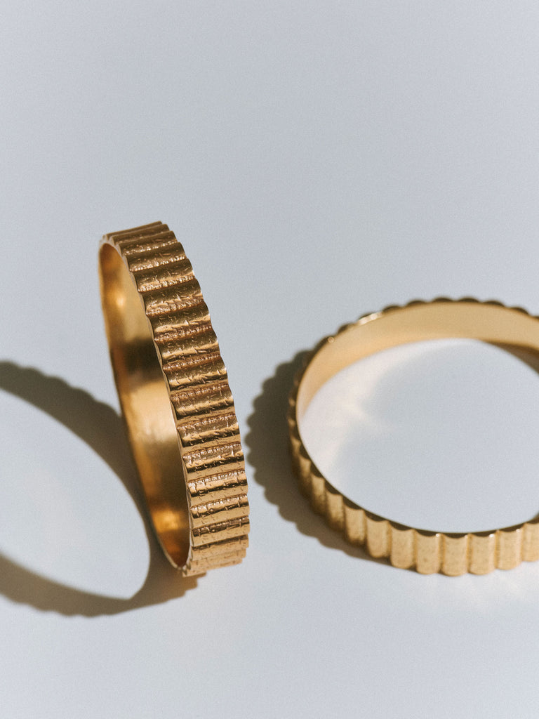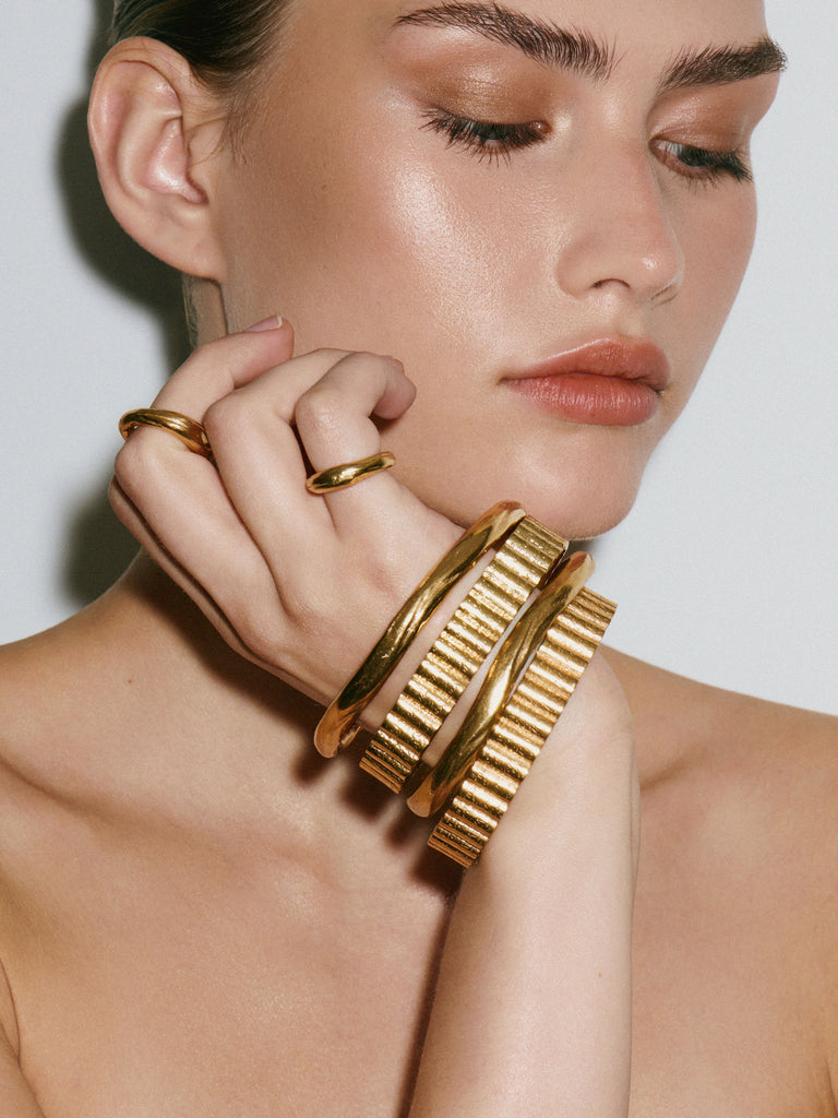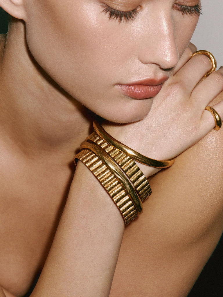 The Utility bangle is handcrafted from 24kt gold plated recycled bronze.