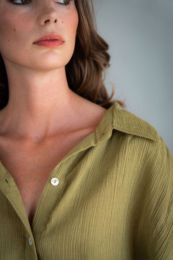 The crinkle shirt dress is our new bestselling silhouette. Crafted in an organic crinkle cotton, light and breezy for an effortless everyday go to look. For city or beach days the skirt creates a wrap around raw edged pareo that ties at the front to flatter every shape. Versatile and timeless.
